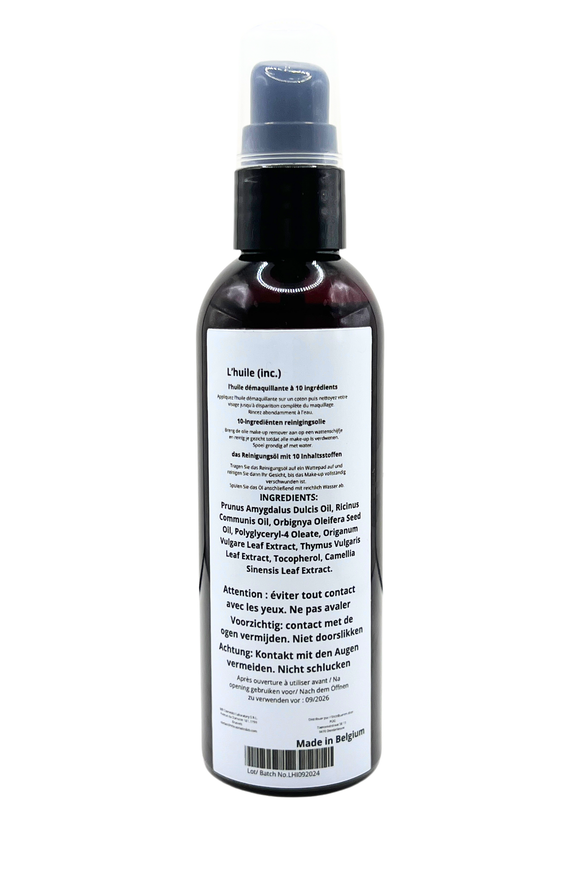 L'huile (inc.) is composed of nourishing plant oil blends, 100% of natural origin. Suitable for all make-up types, including waterproof, its clean, vegan formula gently cleanses face, eyes and lips.